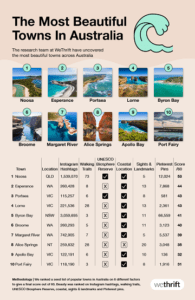 As you can see, researchers have gathered a fabulous list of all the incredible towns to visit in Australia. A perfect fit for any tourist or anyone new to the area who wants to explore. The town Noosa comes in first place, with the location attracting 1.5 million instagram hashtags, including 12,024 pins on Pinterest!