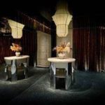 The highlight of the more intimate ‘Ginza Room’ is a breath-taking central chandelier fashioned from sparkly brass, from which spills a dramatic ceiling-hugging spiral of bamboo-leaf forms. The ambience of this inner lounge is invitingly seductive – set with mirrored wall panels and crystal inlays that attract the light and heighten the chemistry between guests sat at voluptuously curved tables.