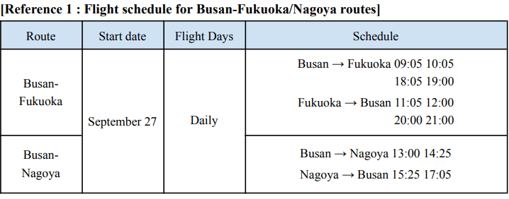 Starting on September 27, the airline will also resume its Busan-Fukuoka and Busan-Nagoya routes. Flights will operate twice a day to Fukuoka, and daily to Nagoya from Busan. These routes will be serviced by the Boeing 737-900ER, with a capacity of 173 passengers.