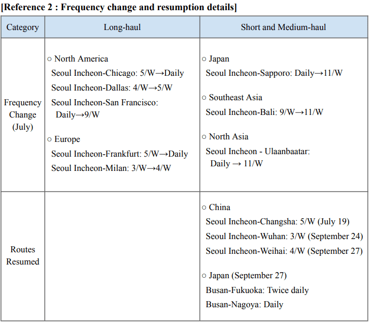 The Seoul Incheon-Changsha route will resume operations with flights five times a week from July 19, and the Seoul Incheon-Wuhan and Seoul Incheon-Weihai routes will resume operations from September 24 and September 27, respectively.