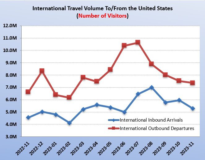 This resurgence is not an isolated phenomenon but a part of a broader narrative of recovery and growth in the travel industry. The data from November 2023 further corroborates this trend, with international visitor arrivals to the United States and outbound travel departures by U.S. citizens marking significant year-over-year increases.